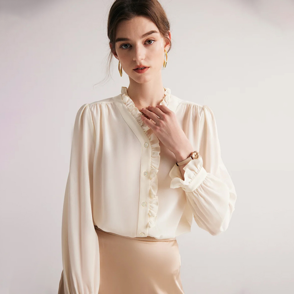 What sets this blouse apart is its unparalleled quality and design. Crafted from 100% Mulberry silk, it promises not only luxury but also durability. The attention to detail in the ruffle decoration and the classic V-neck cut ensures a flattering fit for all body types. Furthermore, its solid pattern and straight clothing patterns offer a canvas for personal expression, allowing you to accessorize and make the piece truly your own.