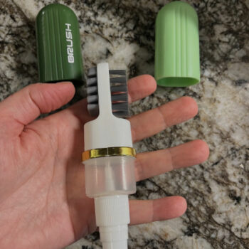 I'm impressed by the convenience of this shoe brush cleaner. Its compact size fits snugly in my hand, although removing and replacing the end caps can be tricky. The spray nozzle works well, and the soft bristle brush effectively removes dirt from tight spots. The 2-sided silicone head is intriguing and gentle on suede, ensuring a uniform appearance. Perfect for quick touch-ups before heading out!
