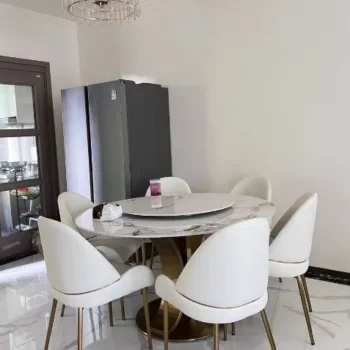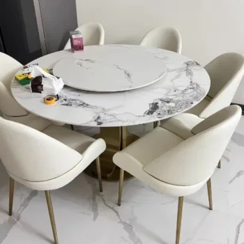 This dining table is a game-changer! The sleek marble top and the stunning gold frame give my dining area a sophisticated look. The turntable feature has made meals more interactive and fun. It's spacious enough for big family dinners yet elegant enough to impress my guests. Assembling it was straightforward. Truly a 5-star product!