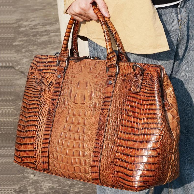 Vintage Crocodile Pattern Genuine Leather Travel Duffle Bag with Lock and Key