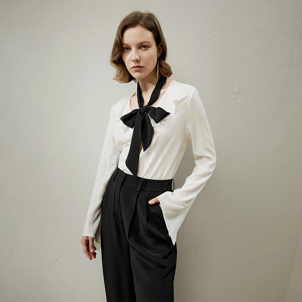 Our Silk Blouse is a marvel of design, offering versatility, style, and comfort. The highlight of this blouse is its 2-in-1 feature with a removable tie, allowing you to style it in multiple ways to suit any occasion. The graceful ruffle bowneck adds a touch of sophistication, while the trumpet sleeves with side slits provide a modern twist on classic elegance. Whether you’re attending a casual meet-up or a formal event, this blouse is your go-to choice for making a statement.