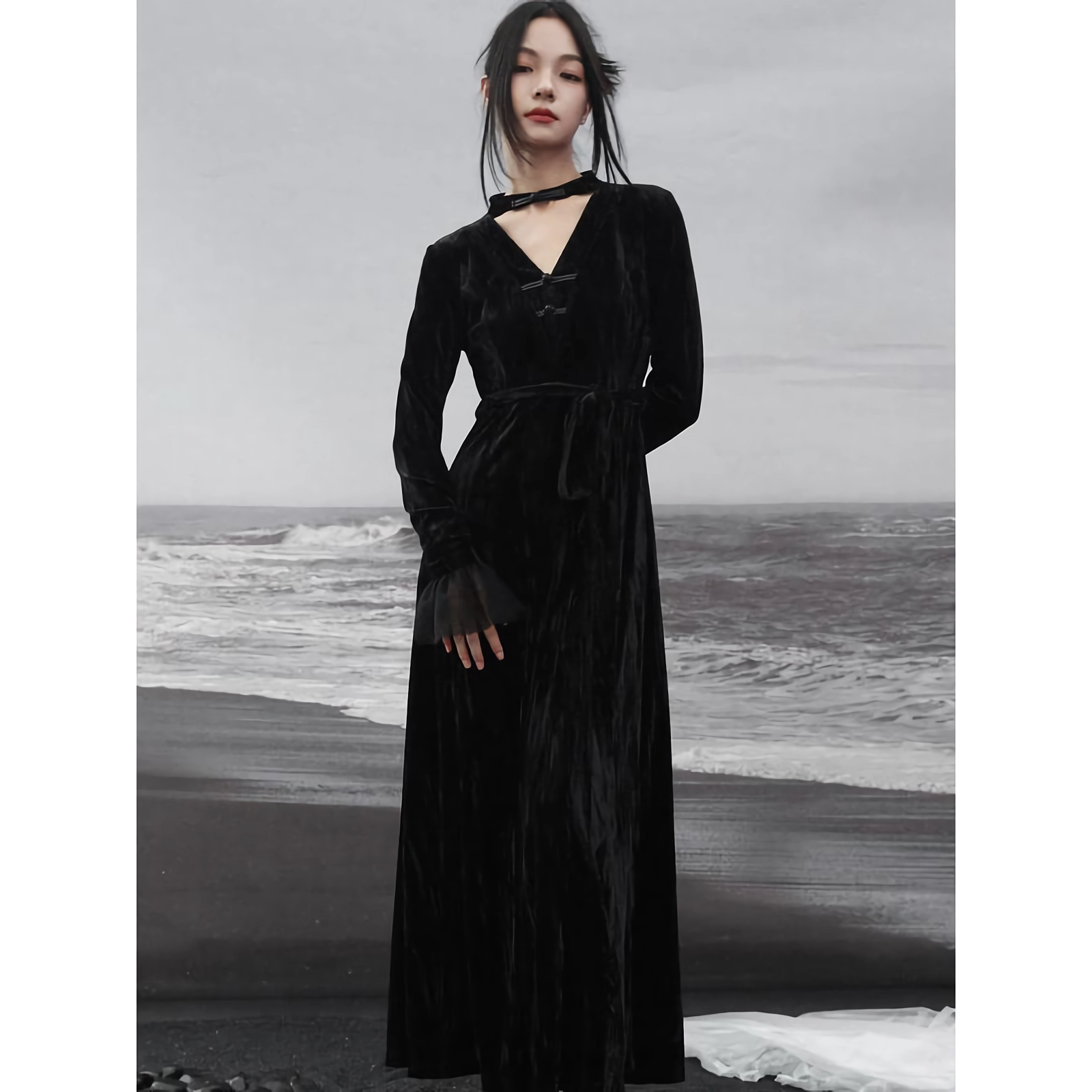 Step into a world of classic beauty and subtle glamour with our Velvet Splice Mesh Long Dress. Designed for the woman who appreciates elegance and timeless style, this dress is perfect for autumn and winter occasions. Whether you’re attending a sophisticated evening event or looking for a unique piece to add to your wardrobe, this dress promises to elevate your style with its vintage charm and romantic allure.