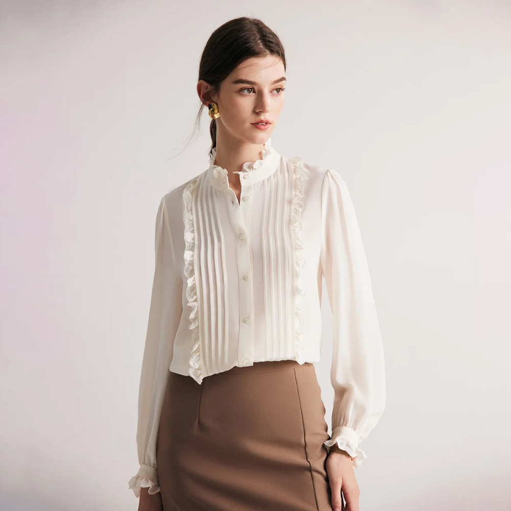 Don’t miss out on the opportunity to own this exquisite piece. Whether you’re refreshing your office attire or looking for a versatile top that can take you from day to night, our White Silk Blouse with Stand Collar & Ruffles is your go-to choice. Shop now and experience the perfect blend of luxury, comfort, and style. Make it yours today and redefine your style statement.